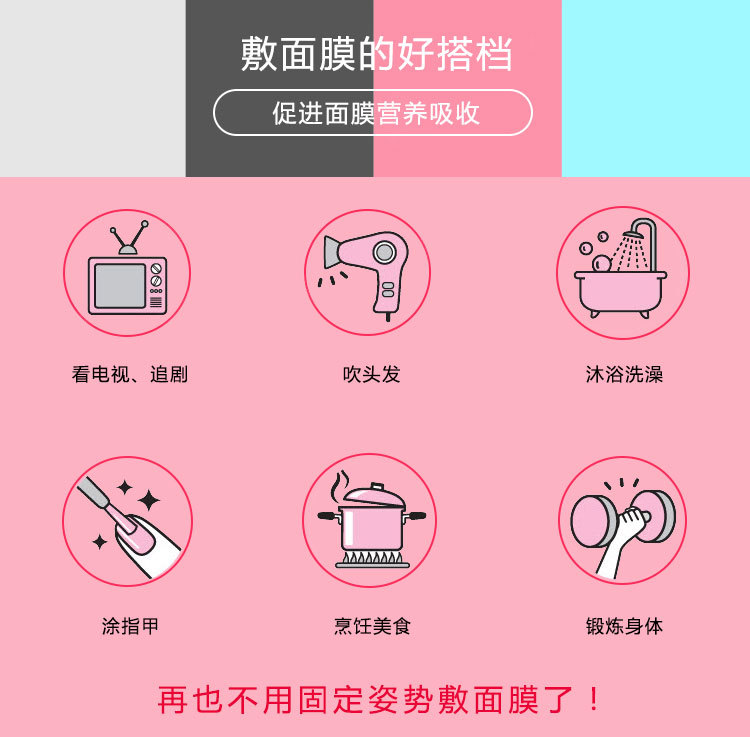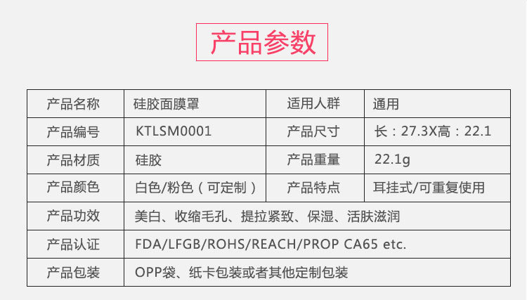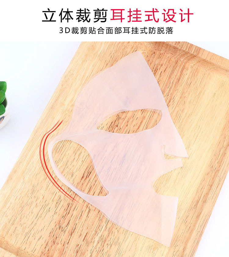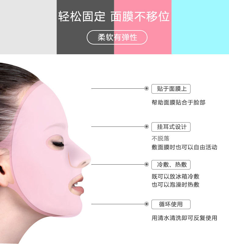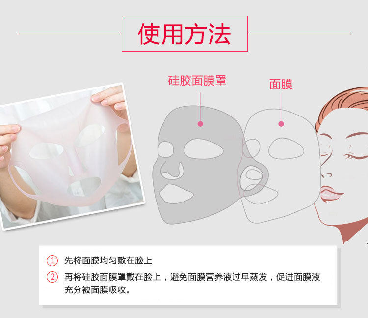 特點(diǎn):環(huán)保硅膠材質(zhì),反復(fù)清洗使用,伸展性良好,貼合臉部有效防止面膜精華和水分過(guò)早蒸發(fā),影響吸收;面膜罩耳掛設(shè)計(jì),有效防止面膜移位或脫落,適合各種臉型。